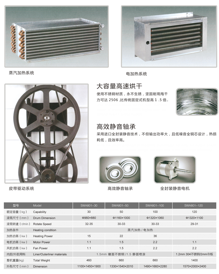 1. 本機大口徑裝載門,投取衣物方便實用,并配有透明鋼化玻璃,隨時可查看衣物烘干情況; 2. 本機采用先進獨特的風道結構,可有效提高熱交換效率,縮短烘干時間、節約能源。滾筒采用正反轉設計,工作時,按照正轉一停一反轉一停的順序反復自動循環,并有定時控制,有效防止大件衣物(如床單)纏繞和起皺; 3. 本機采用電腦自動控制,可根據用戶需要及衣物特點,對烘干溫度、時間進行自動控制; 4. 本機結構式為箱柜式,結構緊湊,可利用狹窄地方安裝,內筒采用不銹鋼板制成,堅固耐用; 5. 本機毛絨收集采用抽屜式,拉出即可清潔,整機為全封閉結構,較其他同類產品相比,顯著減少熱能損耗,有效改善洗衣房環境,降低綜合使用成本。